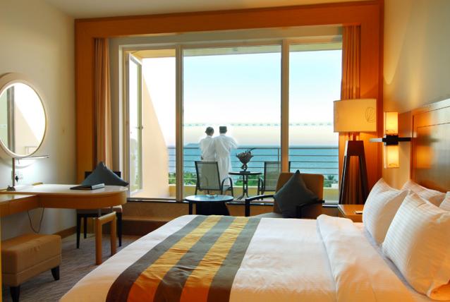 180度豪華海景房,面積48平方米,樓層5-7層,有陽臺,180度海景,大床(1.8*2米),雙床(1.2*2米),有浴缸,免費(fèi)寬帶